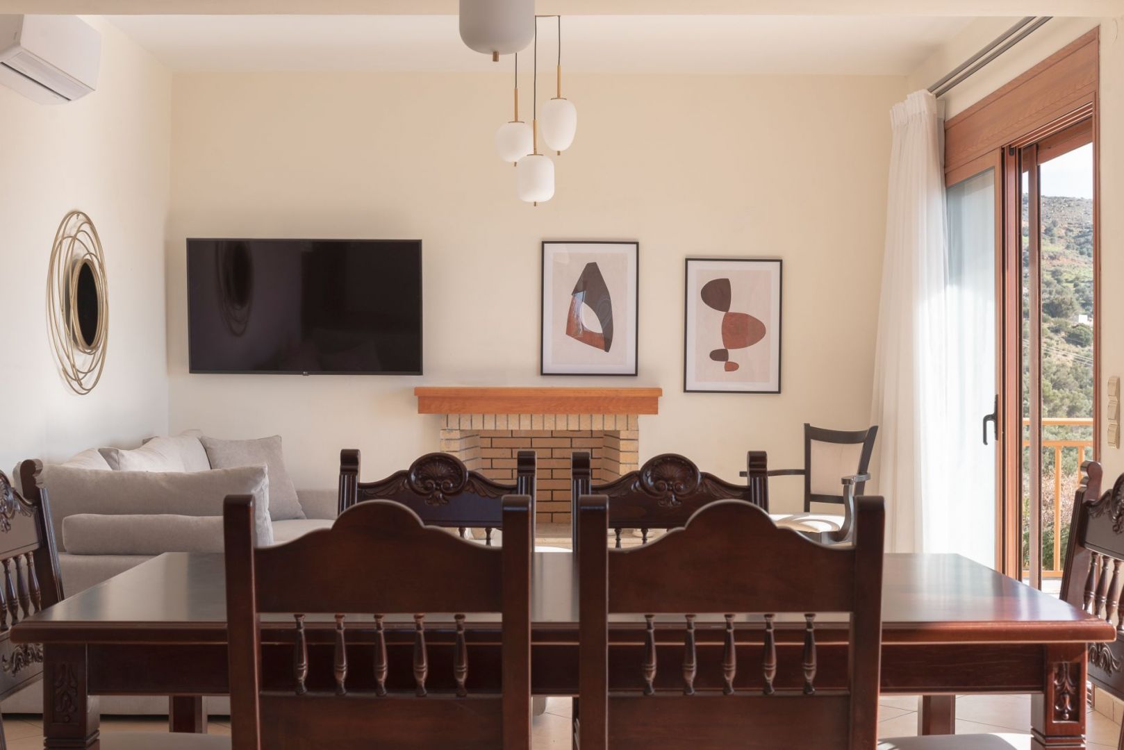 Στο ισόγειο υπάρχει ένα μεγάλος ενιαίος χώρος, σαλόνι και καθιστικό με δορυφορική τηλεόραση & στερεοφωνικό. Επίσης υπάρχει μια πλήρως εξοπλισμένη κουζίνα με μεγάλο τραπέζι, ένα WC και τζάκι με ξύλα. Η κουζίνα είναι ιδανική για οικογένειες και διευκολύνει το μαγείρεμα, την προετοιμασία γευμάτων & σνακ αφού παρέχει από ψυγείο με παγομηχανή μέχρι κουζίνα, φούρνο, φούρνο μικροκυμμάτων, βραστήρα, αποχυμωτή, καφετιέρα και τοστιέρα μέχρι μαχαιροπίρουνα, ποτήρια, μαγειρικά σκεύη, κ.α.