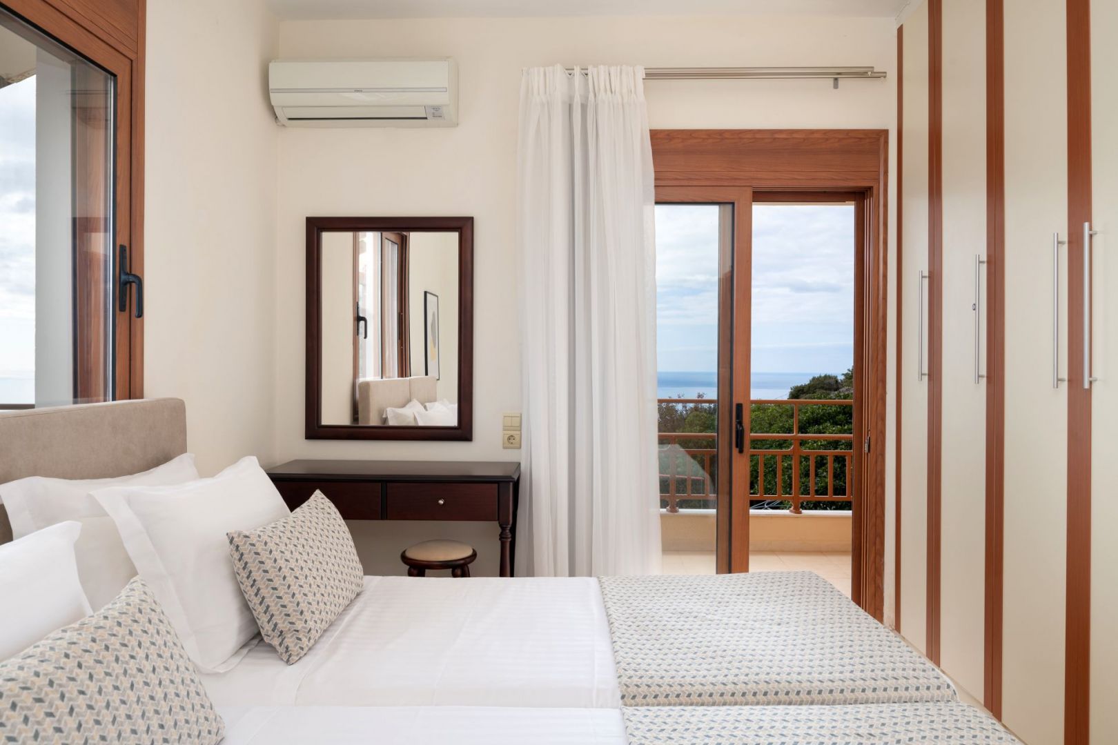 Στον όροφο κάθε βίλλας υπάρχει μια μεγάλη κρεβατοκάμαρα με υπέρδιπλο κρεβάτι, κλιματισμό και πρόσβαση σε μπαλκόνι με πέργκολα. Η δεύτερη κρεβατοκάμαρα έχει δύο μονά κρεβάτια (με δυνατότητα ένωσης σε διπλό) και είναι επίσης κλιματιζόμενη. Οι κρεβατοκάμαρες διαθέτουν εντοιχισμένες ντουλάπες και τηλεοράσεις LCD. Τέλος, υπάρχει ένα μεγάλο μπάνιο εξοπλισμένο με πλυντήριο ρούχων, στεγνωτήριο, σίδερο και σιδερώστρα.